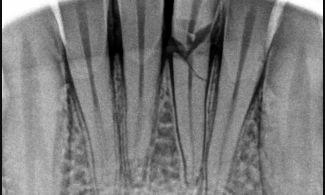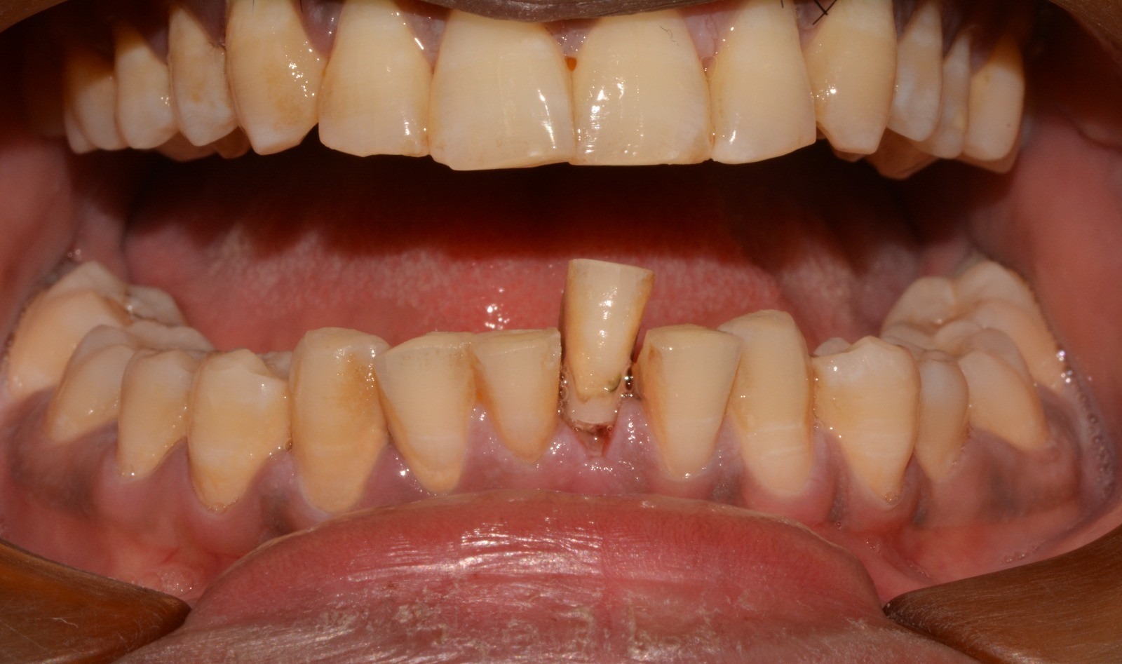The trauma caused by the soccer ball led to a severe horizontal crack in the tooth that made it loose and impossible to save. The surrounding bone was thin for placing an implant immediately.